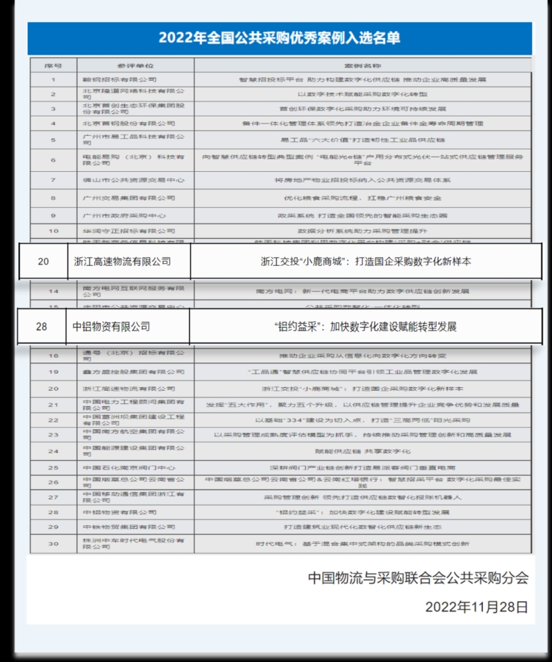 12月1日,中物联公共采购分会发布了关于“2022年度全国公共采购优秀案例”入选结果的通知。商越科技携浙江交投、中铝集团等多家企业成功当选“2022年度全国公共采购优秀案例”。