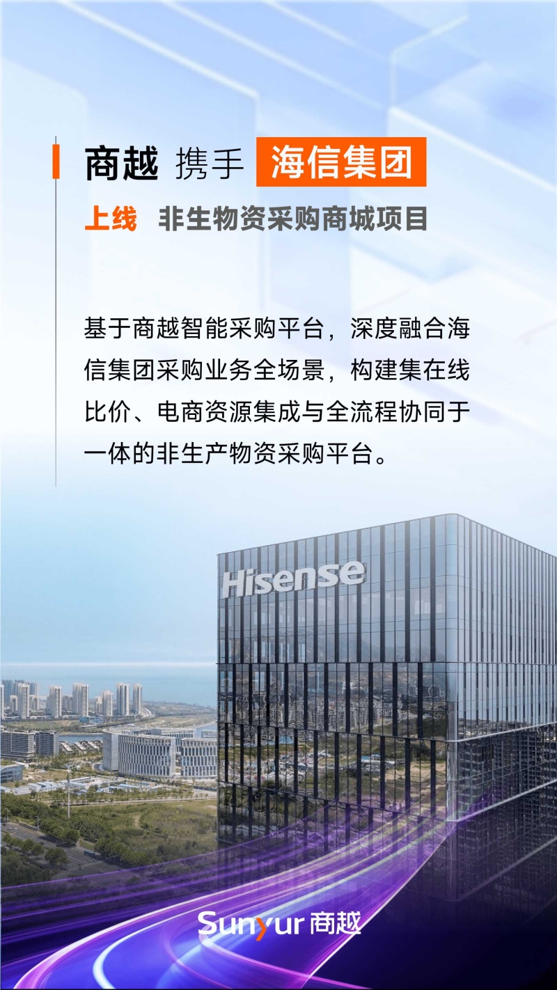 近日,由商越科技打造的海信集团非生物资采购商城项目正式上线。该项目基于商越智能采购平台,深度融合海信集团采购业务全场景,为大型先进制造企业供应链数字化升级树立行业标杆。