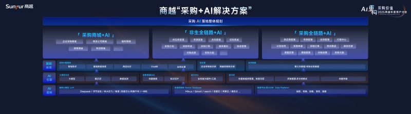 二是“解决方案+AI”,在解决方案层面,商越服务7.0以采购AI落地规划为主线,以R7技术底座与智能体库为支撑,形成覆盖采购全链路的端到端方案体系,包括:“采购商城+AI”、“非生产全链路+AI”、“采购全链路+AI”。