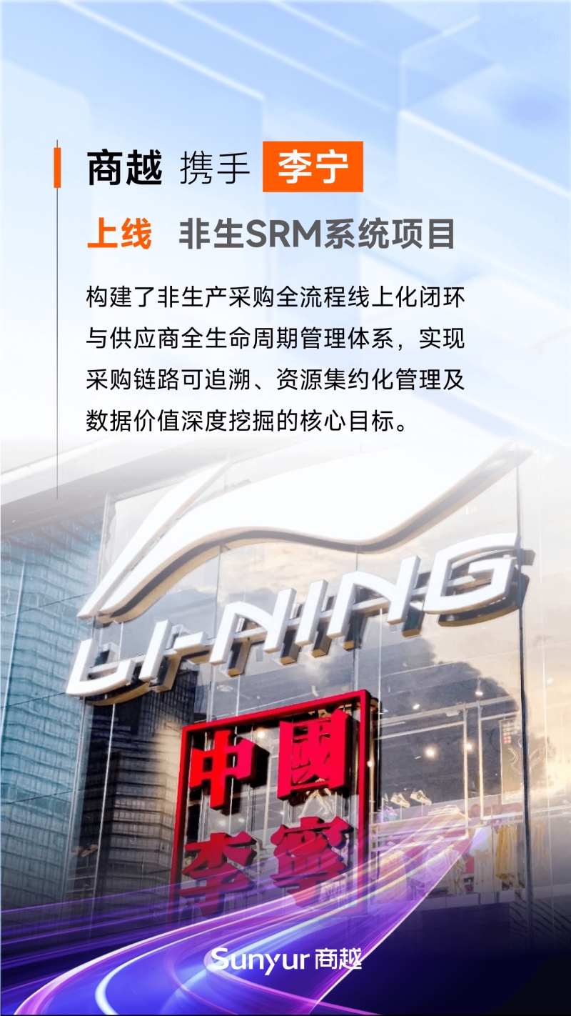 近日,李宁(中国)体育用品有限公司与商越科技合作搭建的非生产采购SRM系统成功上线。此次系统落地标志着李宁非生产采购业务全面迈入线上化、自动化、合规化的数智化新阶段,为体育行业采购管理转型树立了全新标杆。